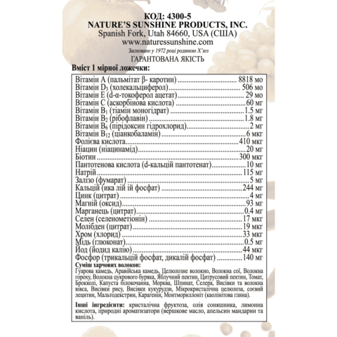 Cristalin de fructoza, guma arabica, fibra de soia, ulei de floarea soarelui, acid oleic, porumb de mare, arome naturale, maltodextrina, fibra de ovăz, fosfat de calciu, acid citric, fosfat de potasiu, beta-caroten, cazeinat de sodiu, fibre alimentare, oxid de magneziu, mono și digliceride, guma guar, clorură de sodiu, citrat de potasiu, clorură de potasiu, vitamina C (acid ascorbic), niacină, citrice pectina, d-alfa tocoferol acetat (vitamina E), biotina, vitamina A, lecitină din soia, fumarat de fier, d-pantotenat de calciu (acid pantotenic), concentrat de roșii, broccoli, varză, morcovi, spanac, țelină, vitamina B6, vitamina B12, vitamina B2, oxid de zinc, vitamina B1, supliment de vitamina D3, acid folic, gluconat cup, citrat molibden, selenometionina, citrat de mangan, clorură de crom, iodura de potasiu.